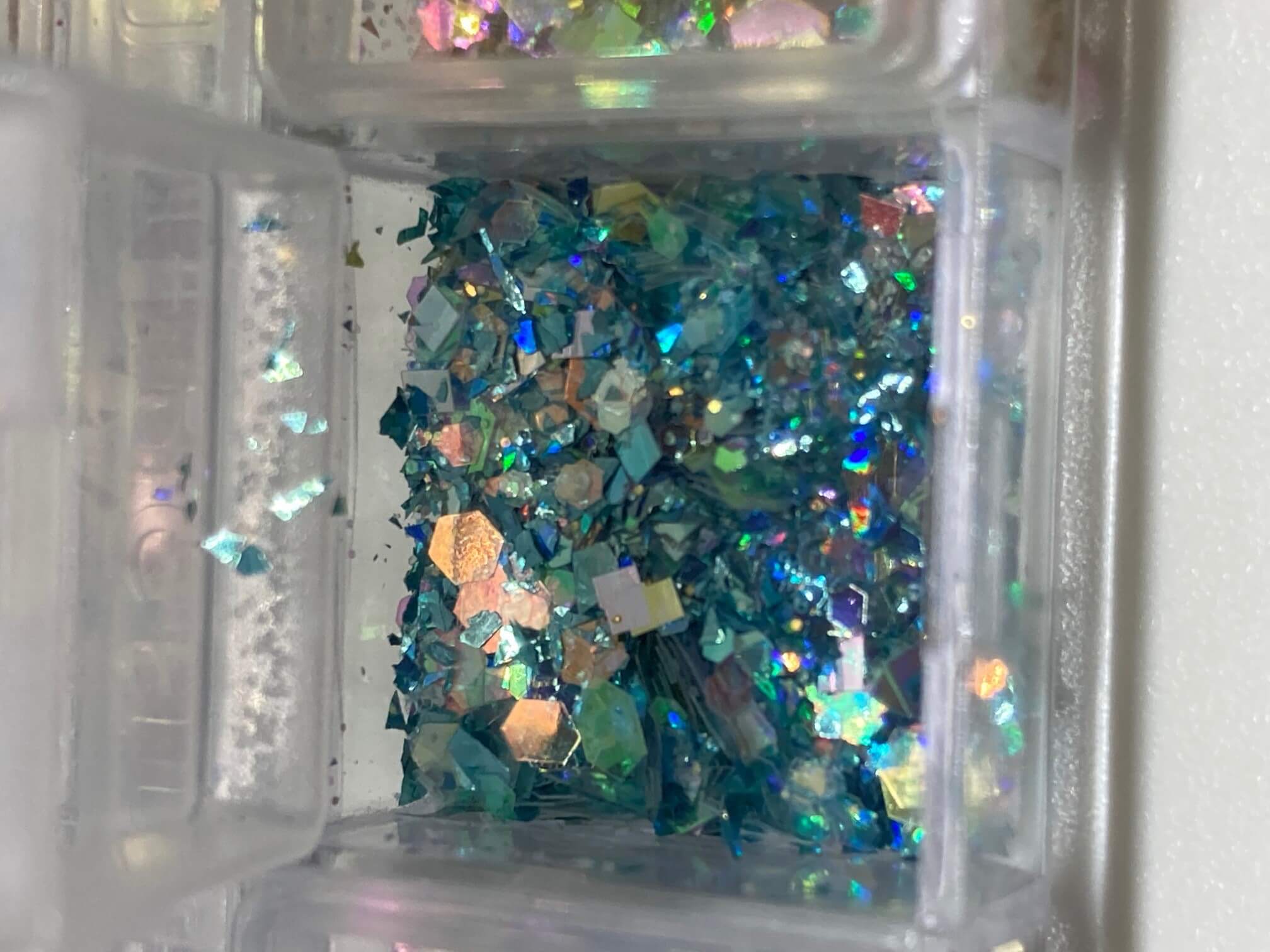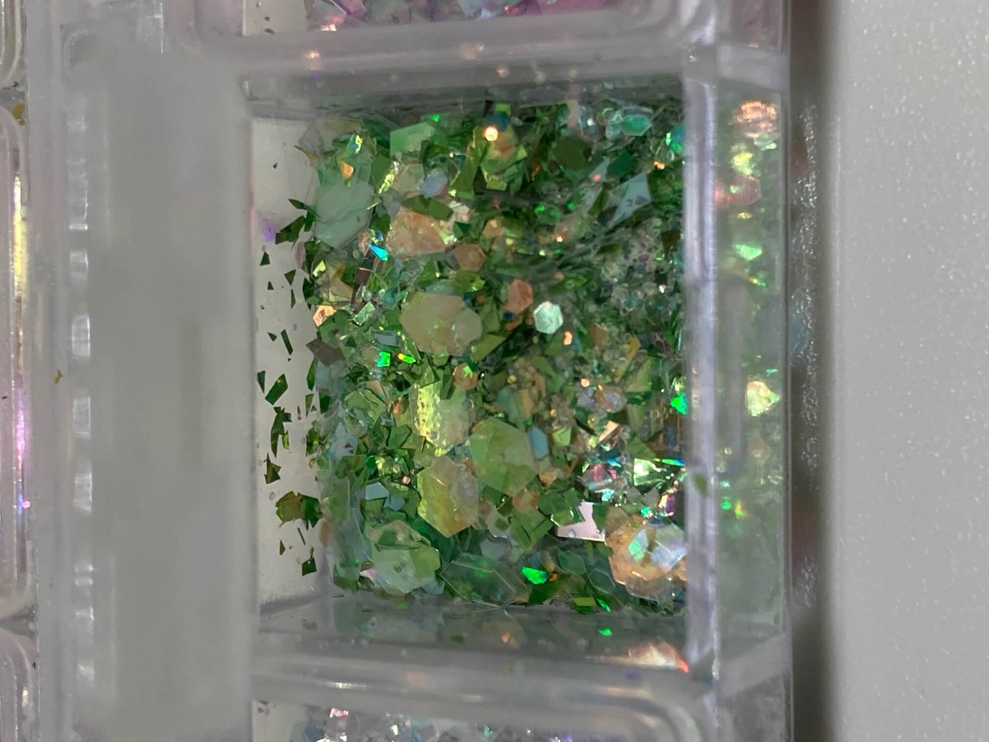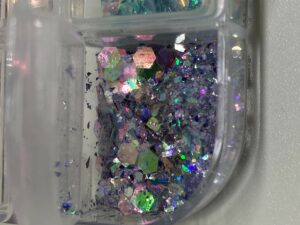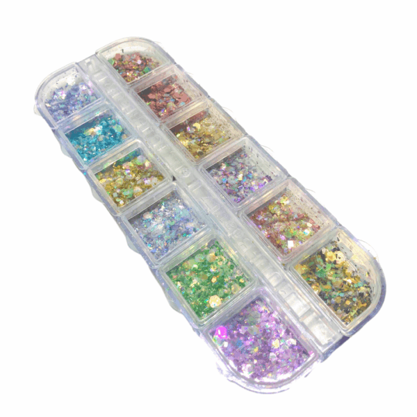 Sottili frammenti colorati per Nail Art. Scatolina con 12 scomparti contenenti frammenti di vari colori.