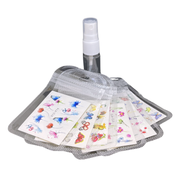 Decalcomanie trasferibili con acqua. Il Kit contiene 6 tavolozze di water decal ed un flaconcino spray per l’acqua. Utilizzare acqua minerale naturale.